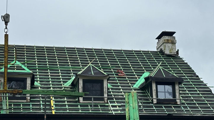 Het renovatieproject omvat een grondige vernieuwing van het dak, inclusief timmerwerk voor de installatie van nieuwe dakramen. De eerste stap is het verwijderen van de oude leien tot op de kepers, samen met de panlatten en goten, om een schone basis te creëren voor de nieuwe dakbedekking.